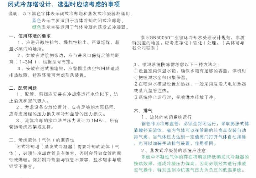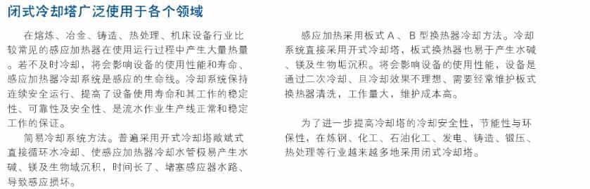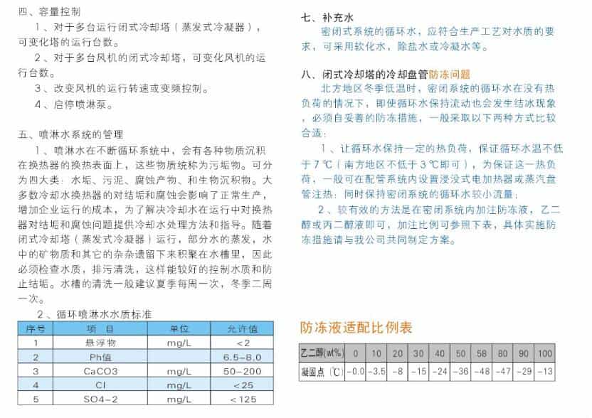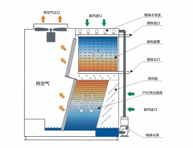 密閉橫流式冷卻塔主要由換熱器,水循環(huán)系統(tǒng)及風(fēng)機(jī)三部分組成。上部裝有噴水裝置,底部為一接水盤。工作運(yùn)行時(shí),循環(huán)液從蛇形管上面進(jìn)入管內(nèi)通過盤管壁與盤管外側(cè)噴淋水和空氣進(jìn)行人交換,用風(fēng)機(jī)很強(qiáng)風(fēng)力,使噴淋水充分覆蓋在盤管外表面上,從而提高了換熱效率。噴淋水和空氣吸盤壁的熱量后溫度升高,部分水由液態(tài)變成氣態(tài),帶走管壁上大量容量,濕熱空氣中的水份被水板界主印入調(diào)料層熱交換層中,熱空氣排出。熱交換層主要水被劉國(guó)棟新風(fēng)冷卻,溫度降低,流入集水槽中,再由水泵送入噴淋系統(tǒng)中,繼續(xù)循環(huán)。散失到空氣的水份有水位控制裝置自動(dòng)調(diào)節(jié)補(bǔ)充。