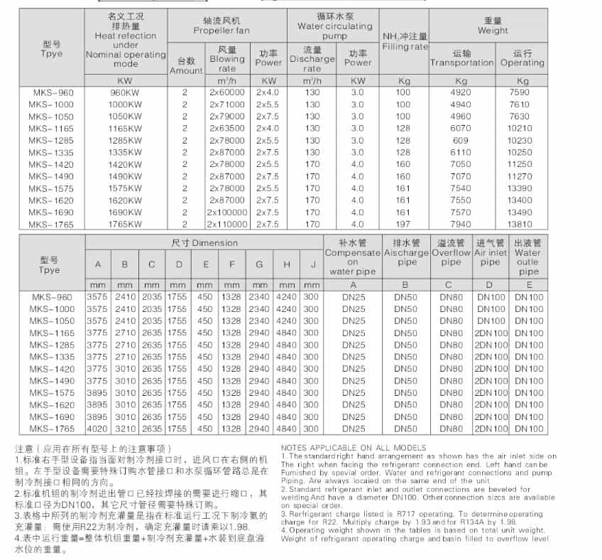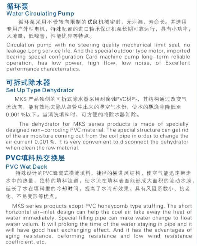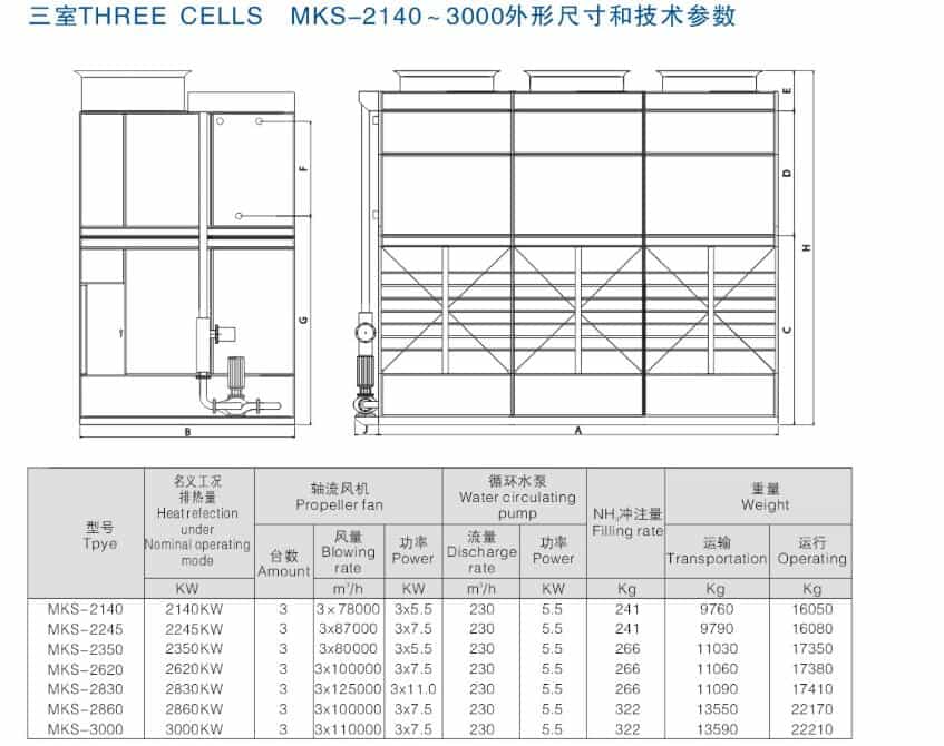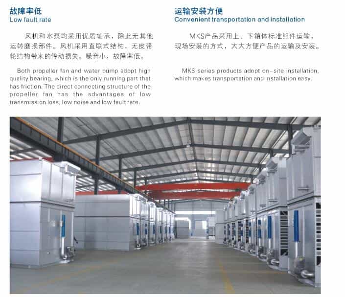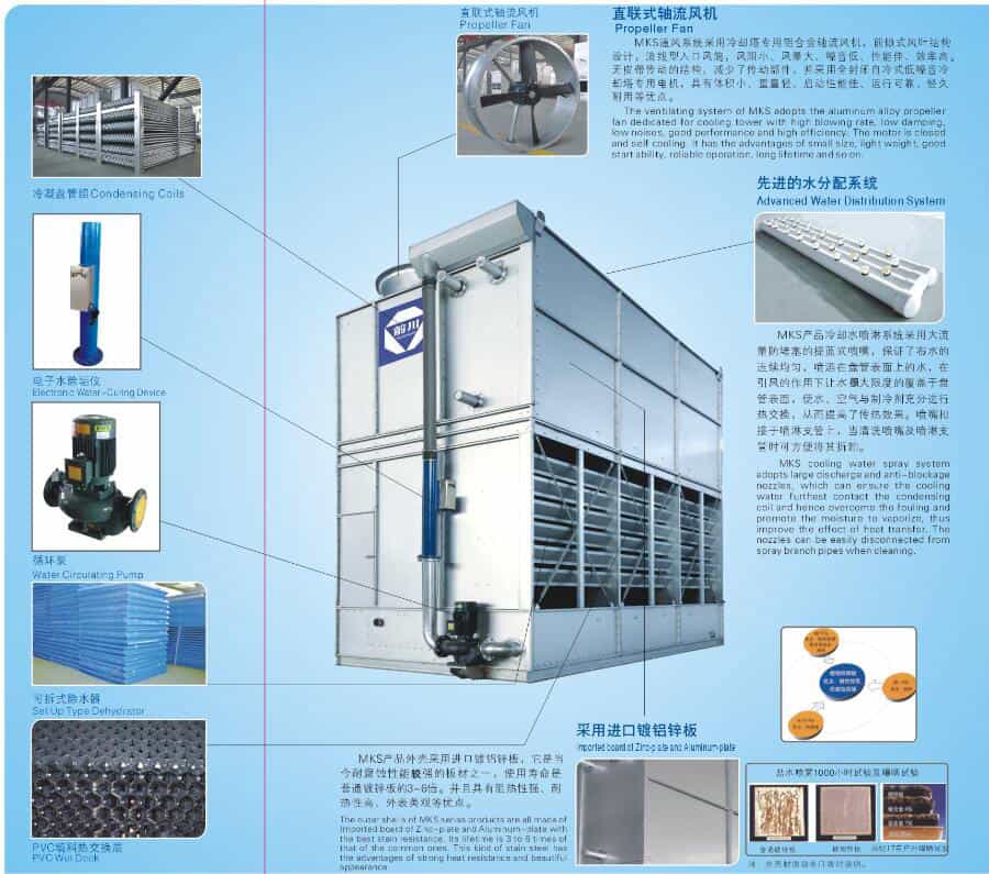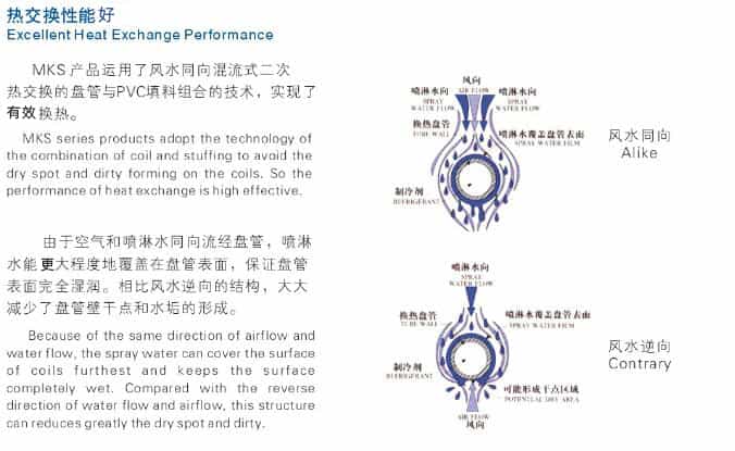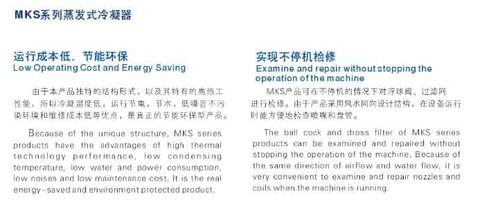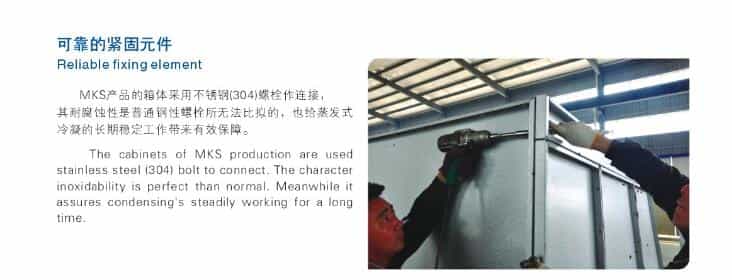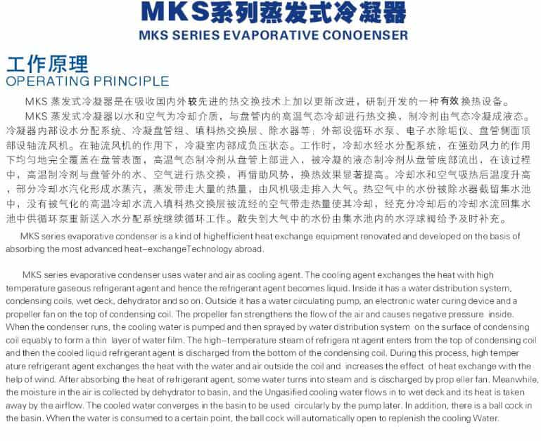 MKS蒸發(fā)式冷凝器是在吸收國(guó)內(nèi)外較先進(jìn)的熱交換技術(shù)上加以更新改進(jìn),研制開發(fā)的一種有效換熱設(shè)備。MKS蒸發(fā)式冷凝器以水和空氣為冷卻介質(zhì),與盤管內(nèi)的高溫氣態(tài)冷卻進(jìn)行交換,制冷劑由氣態(tài)冷凝成液態(tài)。